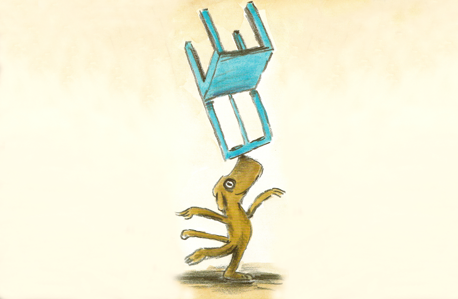 Ce jour-là, Escarbille et Chaboudo se promenaient dans le désert. Et dans le désert, il n’y avait rien. Rien, sauf… une tache bleue, au loin. Ils s’approchèrent : c’était une chaise.